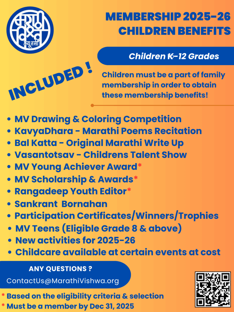 In addition to the above, as a Marathi Vishwa member, you are also eligible to avail of all the programs/initiatives run by Bruhan Maharashtra Mandal – bmmonline.org